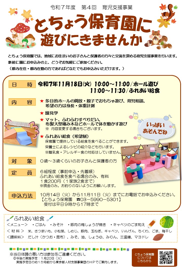 2025/10/14 11月18日(火)に第4回育児支援事業を実施します。現在、参加者を募集しています。詳細はこちらをご覧ください。(PDF/0.8MB)